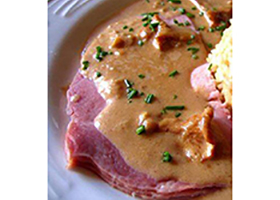 Jambon à l’os, garniture forestière, gratin dauphinois